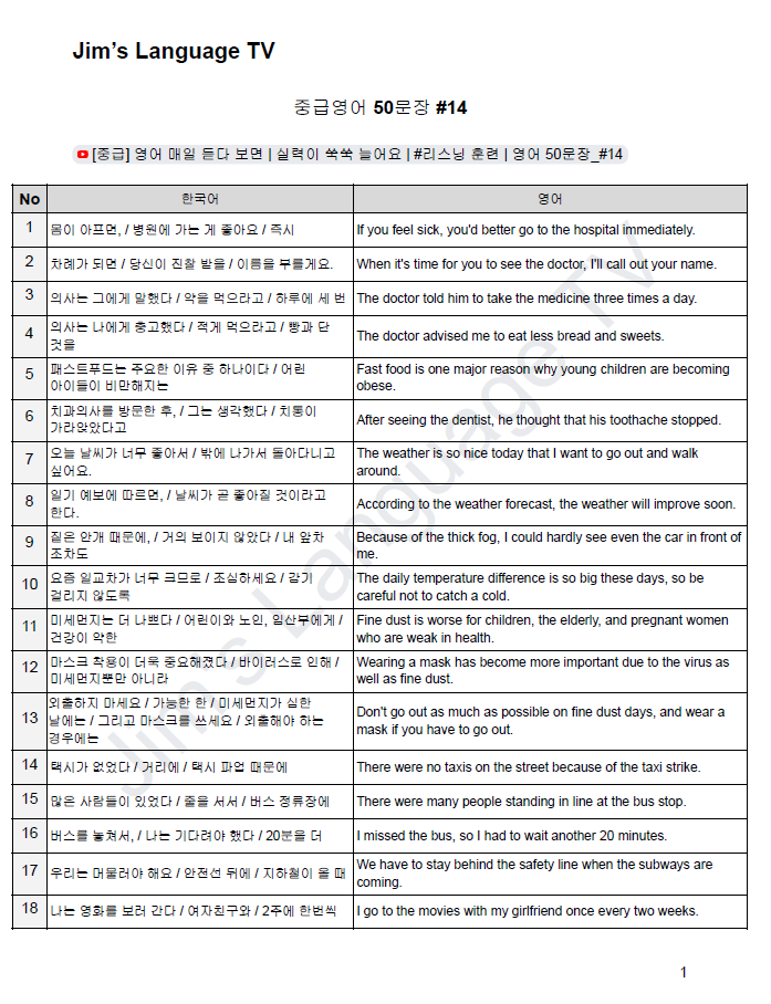 Page 1. [중급] 영어 매일 듣다 보면 | 실력이 쑥쑥 늘어요 | #리스닝 훈련 | 영어 50문장_#14